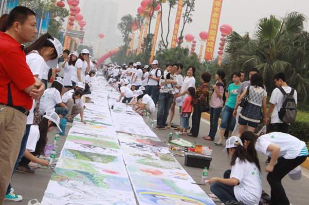 早上6点40分,身着白T恤、头戴白帽的美术学院学生在东区草坪整队集合,7点30分,出发前往大千广场。6点20分,有24名学生在杨荣金老师带领下先行到达现场,提前完成铺画布任务。参加绘画活动是美院大一、大二、大三的全体同学,共分成48个小组参加书画活动。