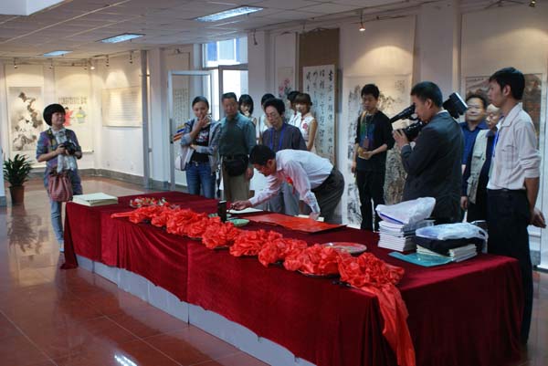 开幕式上,市宣传部副部长、市文联主席刘浩发表讲话,他对德阳书法家们的到来表示热烈的欢迎,对筹备此次交流展的工作者表示衷心的感谢,并预祝交流展取得圆满成功。随后,德阳文联副主席刘代明也发表了热情洋溢的讲话,他指出翰墨飘香道古今,书画传情结友谊。 最后,内江市文化局副局长胡红雨宣布历时4天的2010内江—德阳美术书法作品交流展隆重开幕,出席开幕式的领导同志为开幕式剪彩。