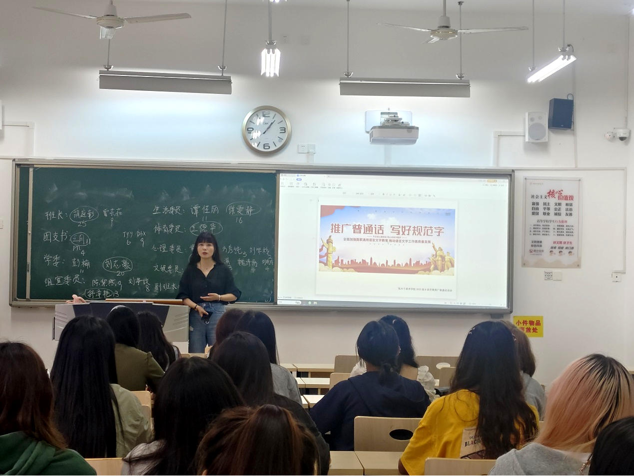 在具体活动方案中,一是各班级利用上课时间开展普通话教学,利用多种媒体,开展普通话训练、指导等相关工作。要求教师课堂教学使用普通话,对教师课堂使用普通话的情况进行调查督导,也督促教师引导学生讲普通话,如熊欣老师进行推普宣传活动,培养学生讲普通话的积极性和自觉性。二是举行主题班会,在班会总结交流会上,班主任老师分享了自己的普通话使用经验和心得体会,让学生在短时间内获得丰富的知识与情感体验,使同学们增强使用普通话意识。如李伟老师围绕普通话和规范汉字开展主题宣传活动,动员学生使用普通话和汉字规范书写,促进美术学院普通话的推广,形成人人讲普通话的良好氛围。