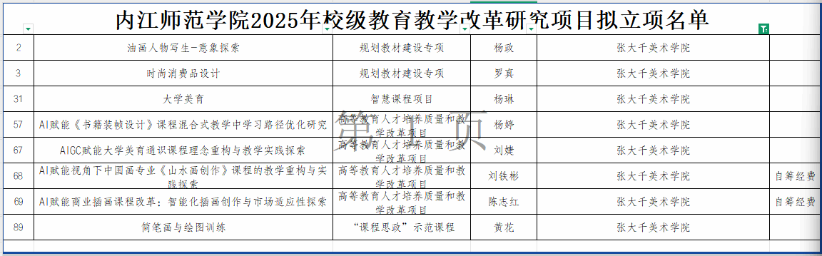 此外,黄花教师主持的《简笔画与绘图训练》入选“课程思政”示范课程。部分课题采取教师自筹经费方式推进,展现出学院在教学改革中的主动性与创新活力。