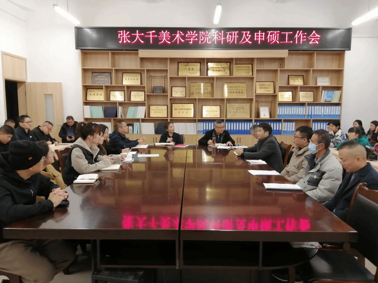 杨坤院长就师资队伍建设与保障工作、专职科研岗位设置与申报工作等做了详细说明,其中专职科研岗设置4个研究方向,定额不超过6人,重点围绕张大千艺术研究、地方非遗保护等领域组建科研团队。根据学校重点工作建设需求、学院科研工作攻关等事项进行了说明,希望教师团队围绕学科建设与硕士学位申请进行高水平成果建设。