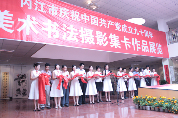 6月30日上午10:30,内江市庆祝中国共产党成立九十周年美术、书法、摄影、集卡作品展在英国BET体育365投注官网西区综合楼展厅隆重开幕,本次展览由中共内江市委宣传部、内江市文化和新闻出版局、内江市文学艺术界联合会主办,内江市文化馆、内江市美术家协会、英国BET体育365投注官网等承办。我院院长张强参加了开幕式并剪裁,另外我院师生代表参加了开幕式。