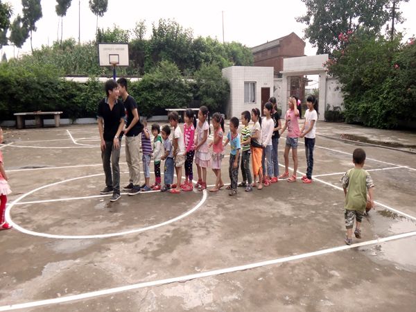 10点20分,小学生们在操场上进行了户外游戏——老鹰捉小鸡,一名志愿者被推举当起了鸡妈妈,“保护”着小学生们。游戏中看到小学生们天真无邪的笑脸,让志愿者们仿佛也看到了自己的小学生活,也是那么的无忧无虑和充满生机。
