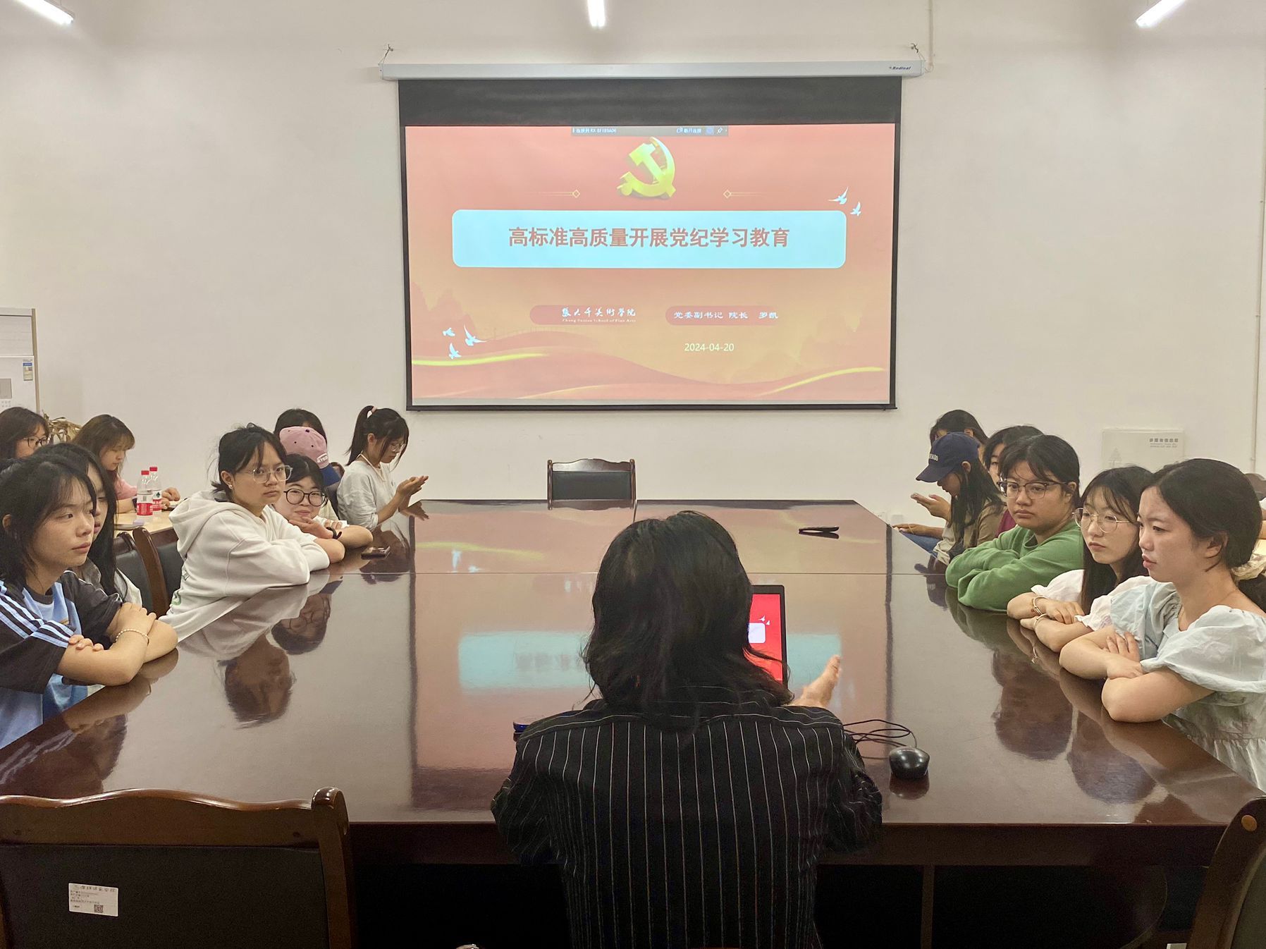 活动伊始,罗院长组织开展主题班会,就党纪学习教育的背景和目的展开说明,罗院长强调:要加强组织领导,采取多种学习方法,利用现代信息技术手段,结合实际案例开展学习,切实推动党纪学习教育制度化、规范化、常态化。紧接着,罗院长结合同学们在校的学习生活实际与同大家展开讨论,罗院长深入分析了专业水平羸弱与就业环境、职业发展前景的利害关系,在听取学生们的反馈意见后,罗院长鼓励并警示2023级4班的同学们要走出舒适区,在认真刻苦钻研专业水平技术的同时,不断拓宽个人理论知识的广度深度,鼓励同学们正向发展,向高处走。罗院长在讲座中强调,作为美育工作者要把对美术教育的热情贯彻到今后生活的每一天,笔耕不断,用自己过硬的专业技术去讲好每一堂课,站好每一班岗,争做学生们美育教育的引路人,不负自己,不负学生,不负社会。最后,罗院长走进大千苑18-3学生寝室,实地查看了解同学们的生活环境,并叮嘱同学们讲文明,讲卫生,注意寝室卫生,共同营造干净整洁的生活学习环境,展现美院学子的良好精神面貌。