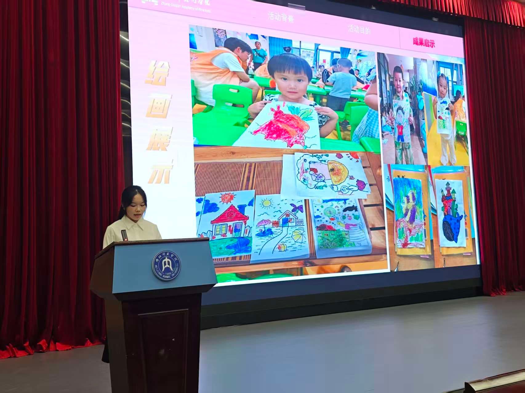 在成果展示环节,“艺润童心绽华彩,情牵稚梦共成长”大千行志愿者服务队代表刘益妹分享了团队在内江市东兴区高晟幼儿园开展的艺术启蒙实践。通过为期五天的主题式美育课程,志愿者们充分发挥美术专业特长,为孩子们带去了丰富多彩的艺术体验。