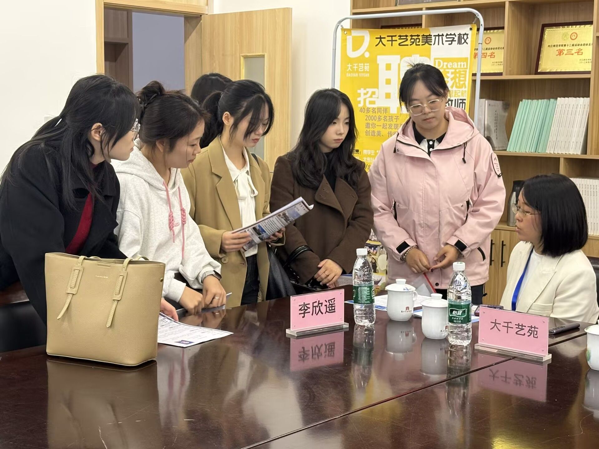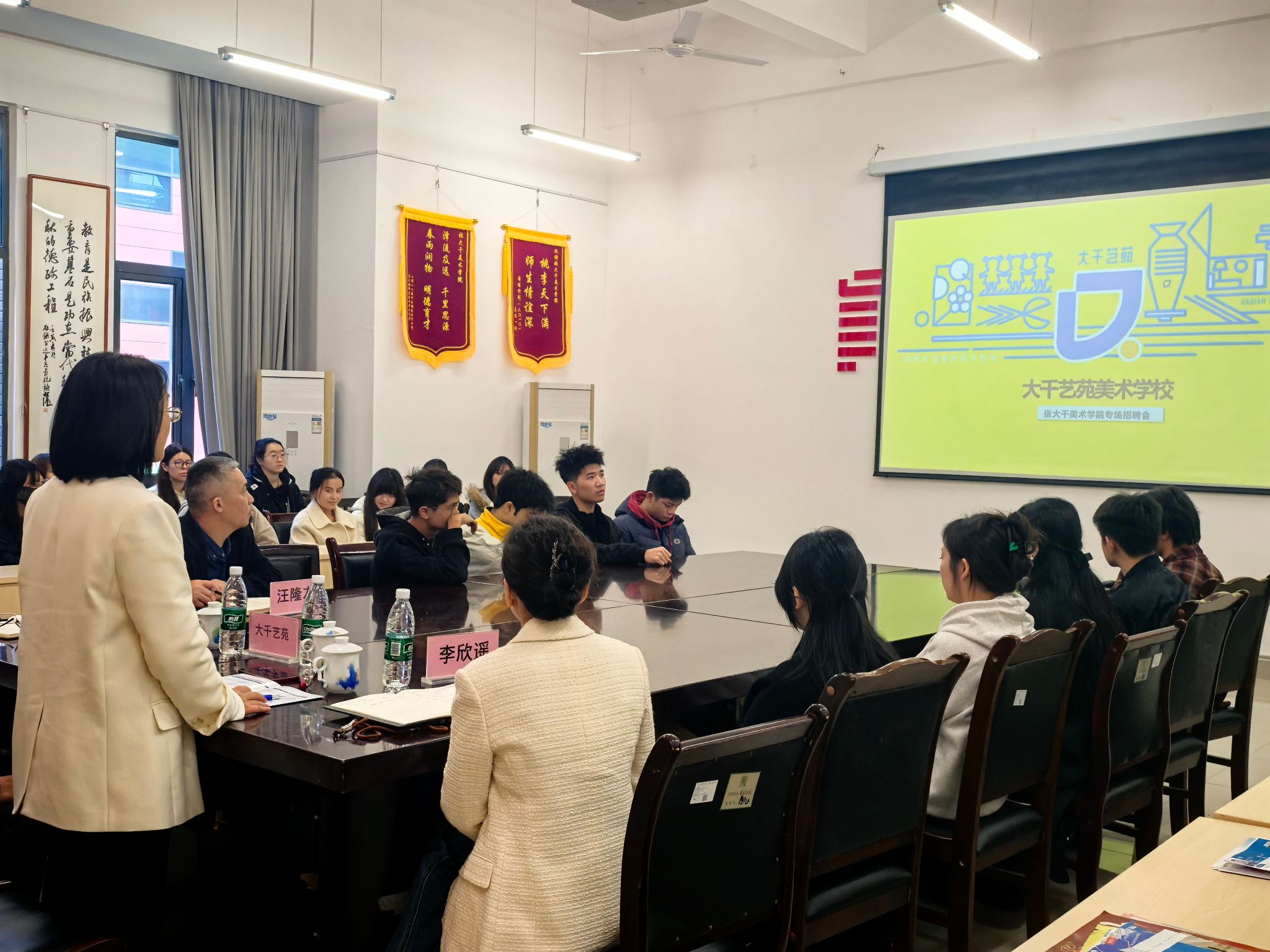 随后,企业代表邓蓉老师重点介绍了大千艺苑的企业特色,详细说明了岗位要求、薪资待遇及发展空间,特别强调了创意思维、软件技能和团队协作能力的重要性。