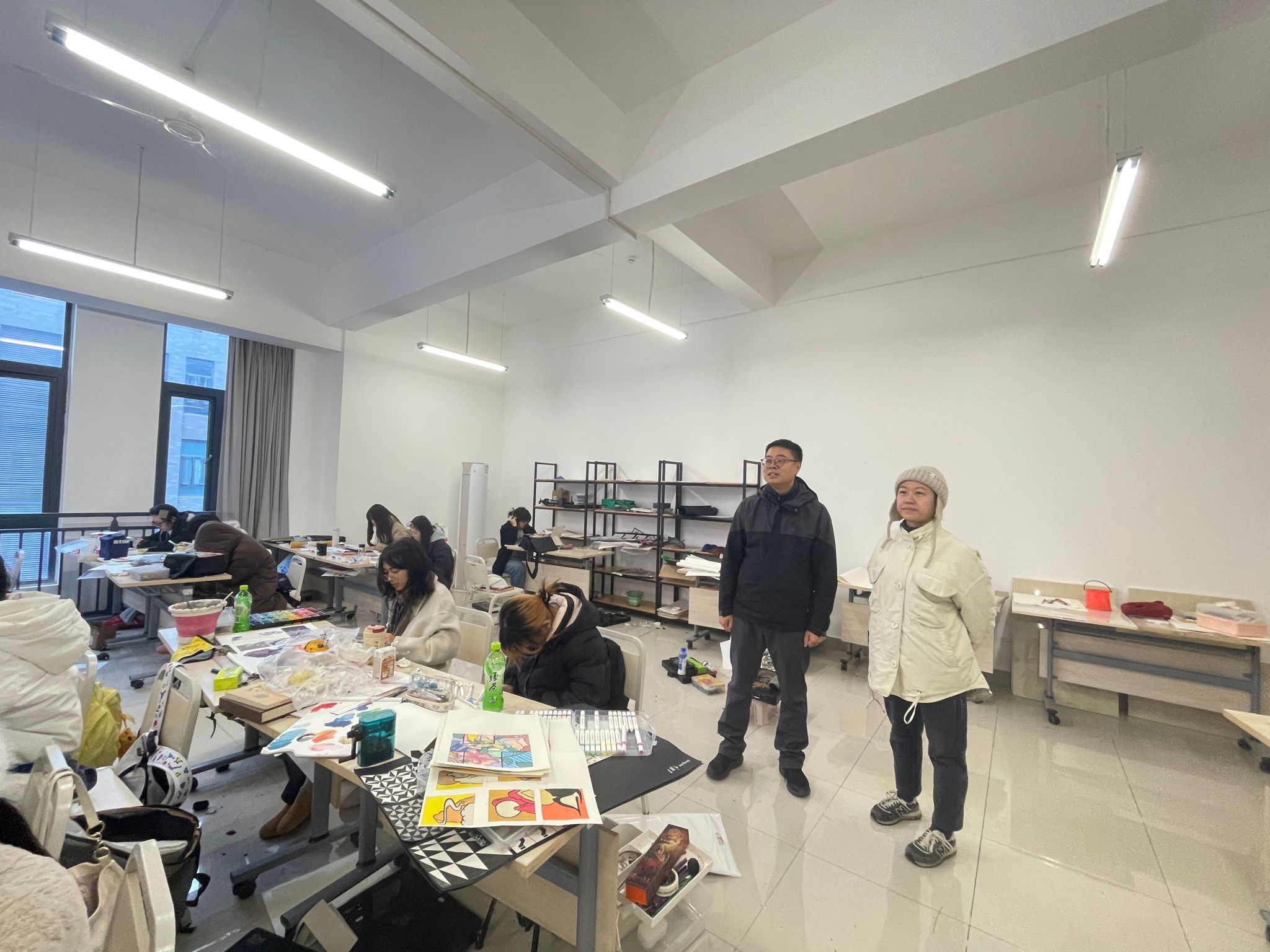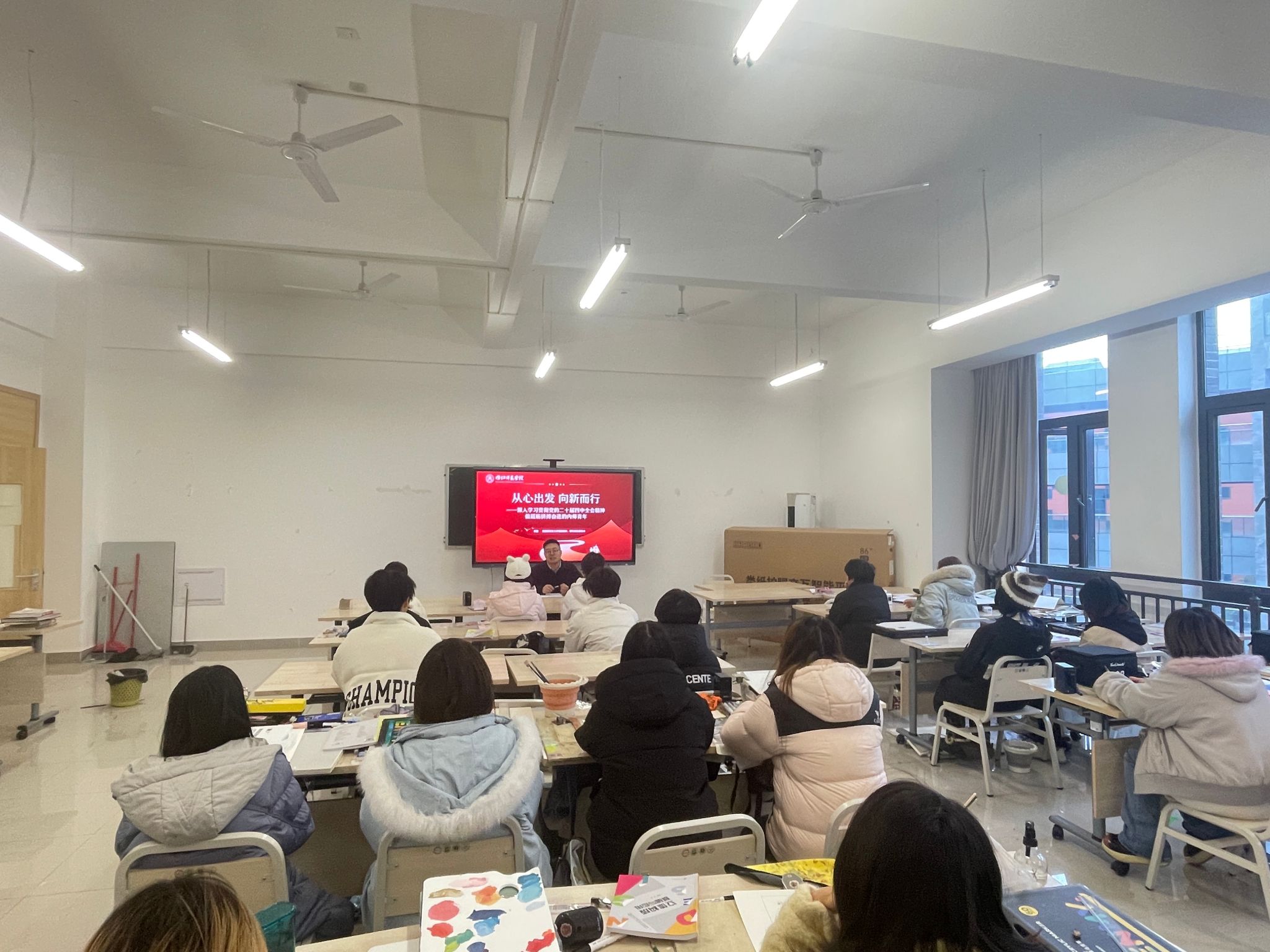 刘磊老师首先走进专业课堂进行实地观摩,跟专业老师了解同学们的出勤、听讲及师生互动情况,切身感受优良的班级学风。随后,他以“从心出发,向新而行——深入学习贯彻党的二十届四中全会精神,做砥砺拼搏奋进的内师青年”为主题,为同学们带来一场充满关切与期待的专题讲座。并围绕学业规划、价值塑造与国际视野拓展,深入浅出地阐述了“十五五”时期的国家发展蓝图,鼓励同学们充分利用中外优质教育资源,在专业学习中淬炼扎实技艺,在设计实践中勇于探索创新,努力成长为兼具家国情怀与国际竞争力的设计人才,让设计有根、有魂、有温度。