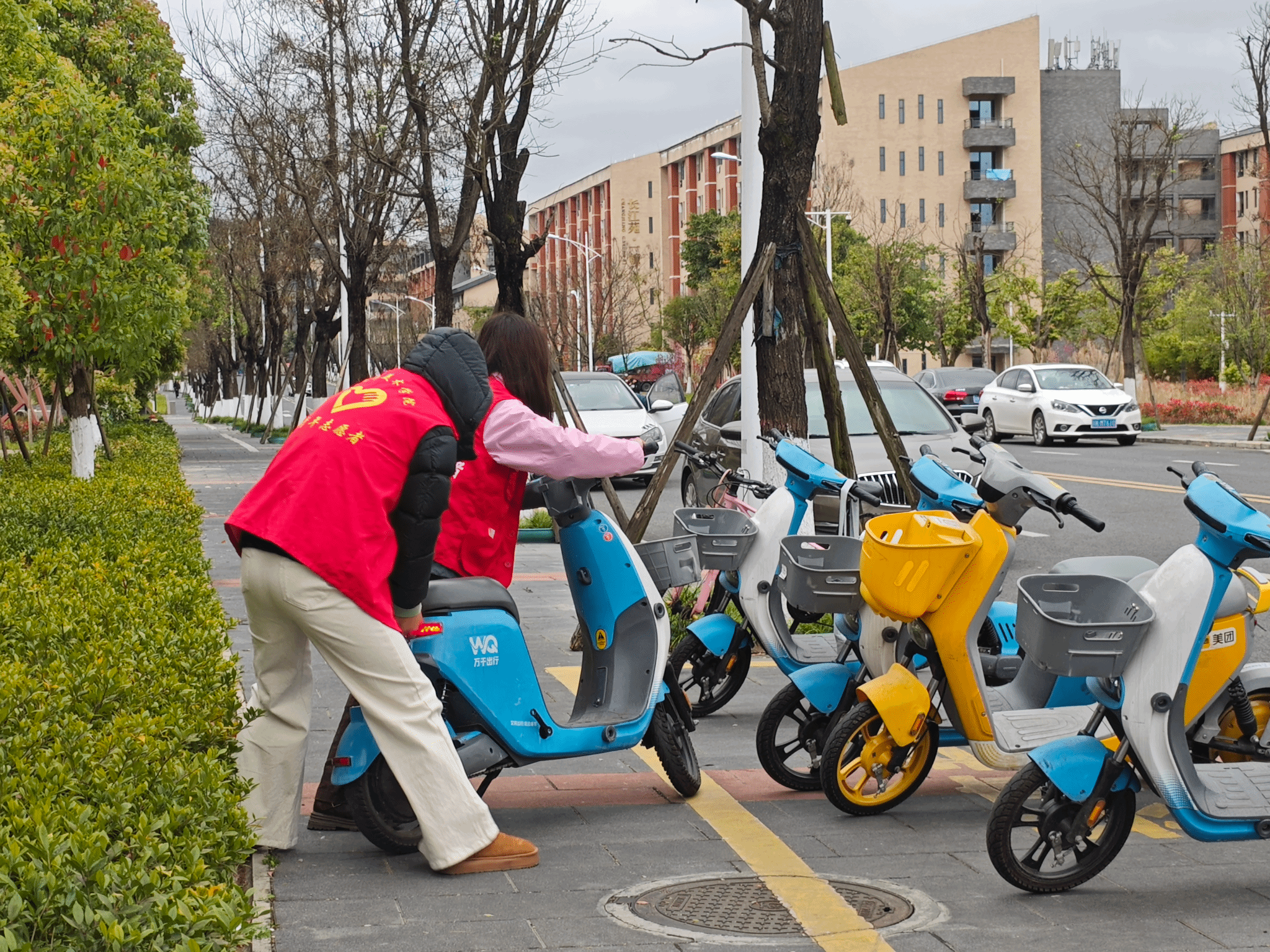 同时,针对校园共享单车、电动车乱停乱放问题,志愿者们对车辆进行规范停放,并积极引导师生文明用车、有序停放,进一步维护校园交通秩序,营造整洁有序的育人环境。
