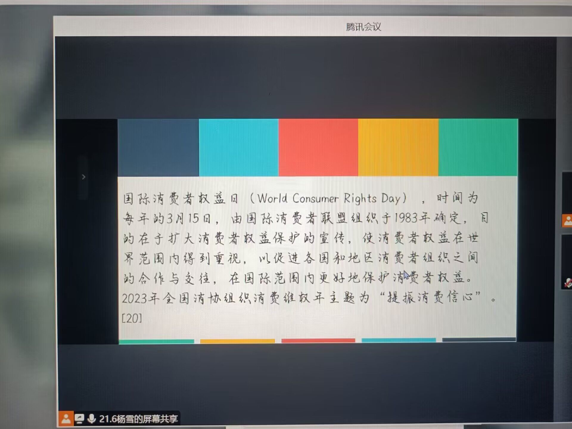 为引导同学们深入了解“3·15”消费者权益日,倡导文明、健康、理性消费,促进同学们增强自我维权意识,营造校园良好消费环境。近日,我院各年级各班通过线上线下的方式组织召开了以“维权知识进校园,促进和谐消费”为主题的消费者权益日宣传教育主题班会。