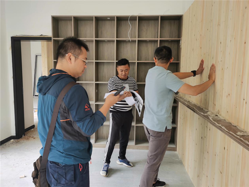 在项目现场,相关单位负责人就项目装修工程的最新情况和存在问题向检查小组作了详细介绍。学院检查小组对项目内部装修细节进行仔细核对,指出了建材及灯具需要根据专业特性进行整改的一些问题。检查结束后,李院长和施工方深入沟通,提出了反馈意见和建议,并强调要加强沟通协调,结合实际情况做好设计方案的调整,加快项目建设进度,确保项目如期完工投入使用。